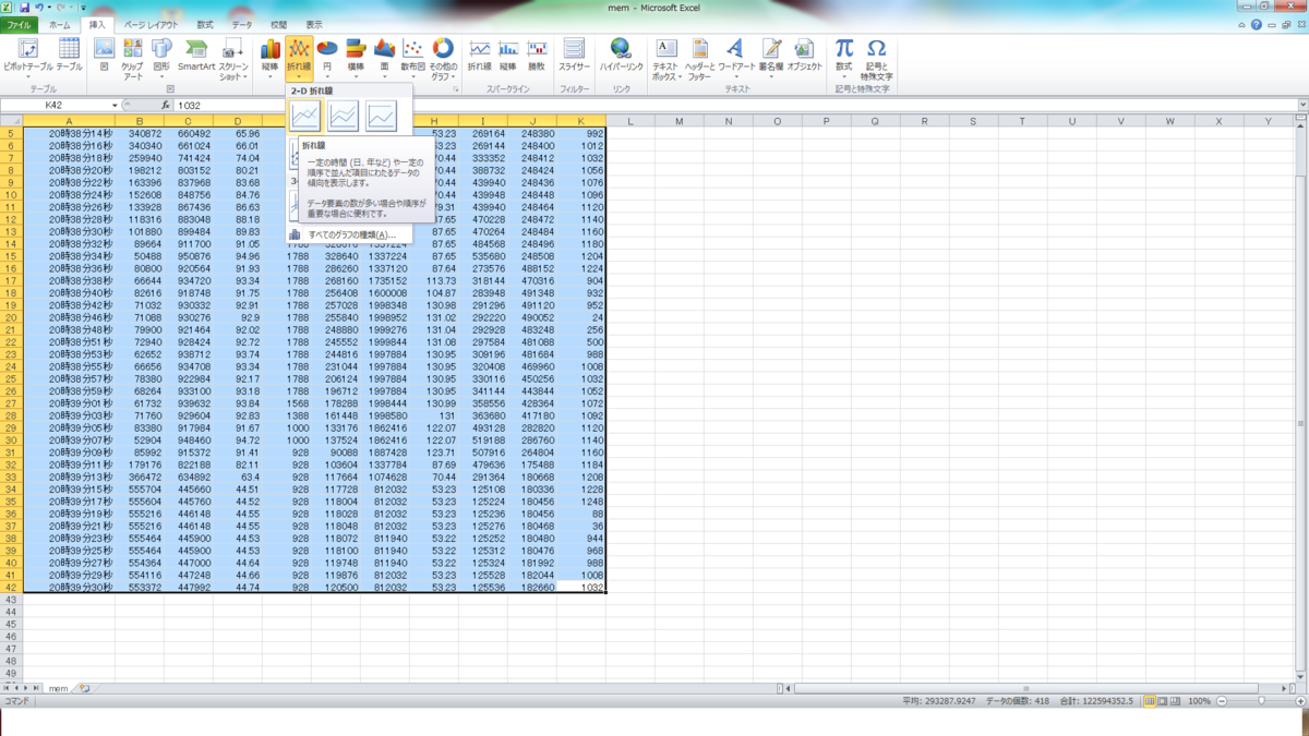 メモリの獲得/開放を繰り返したときの統計情報をExcelで可視化してみます。